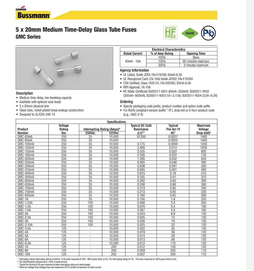 產品名稱: bussmann 原包裝玻璃管保險絲 GMC慢斷 5*20保險絲