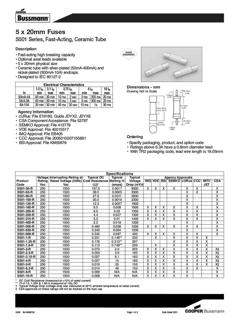 產品名稱: S501 雙銅帽帶引線 陶瓷保險絲