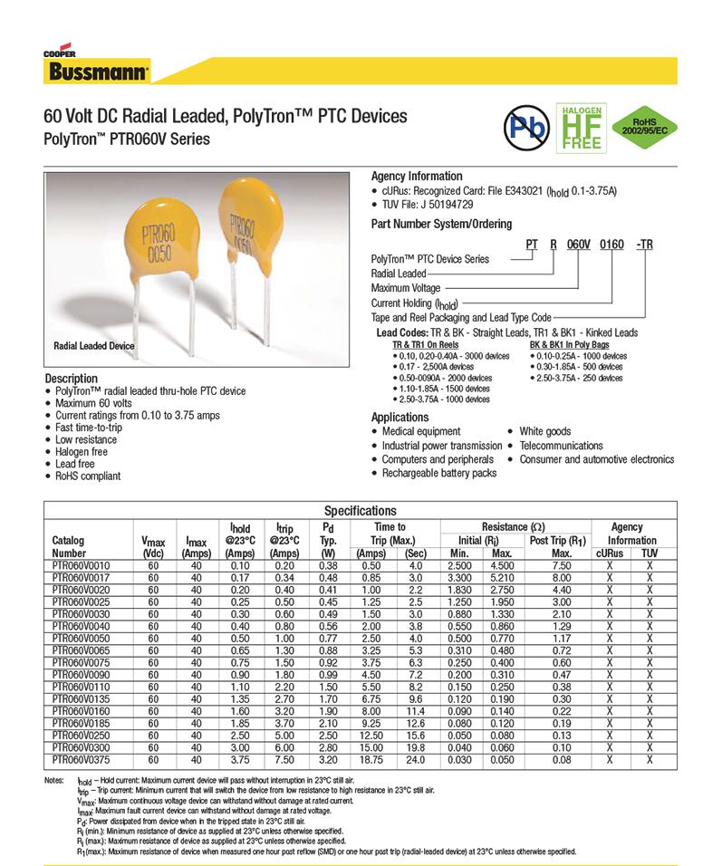 產(chǎn)品名稱: PTR060V0090-TR 可恢復保險絲 圓形 插件保險絲