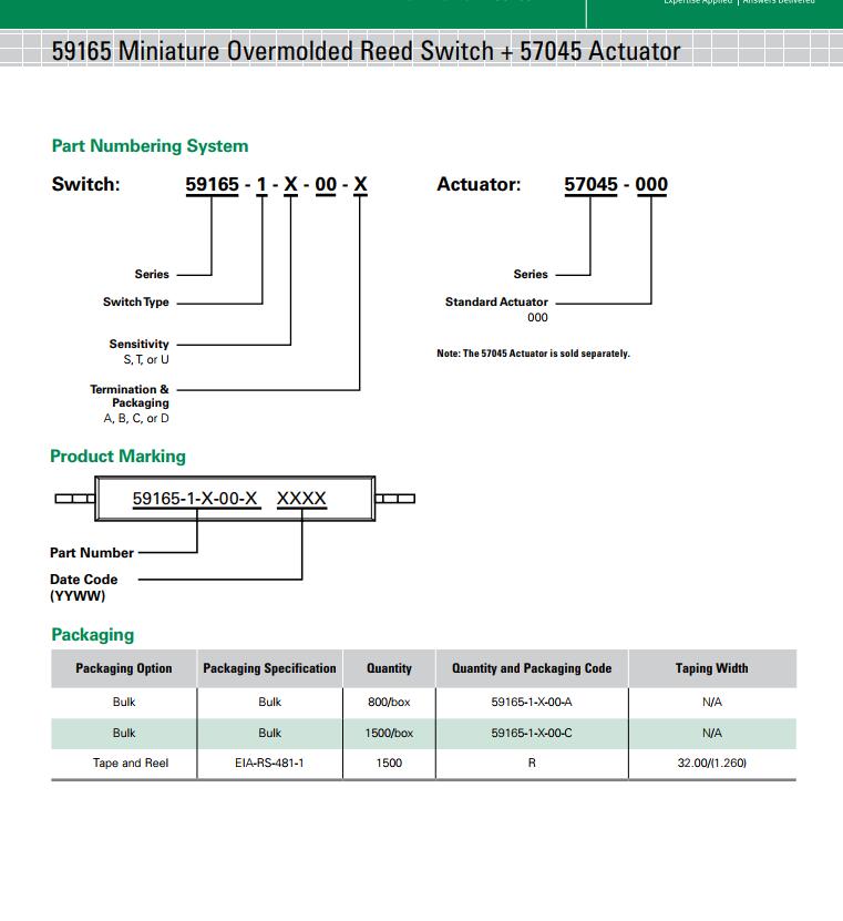 簡述: 59165 系列 - 微型包覆成型磁簧開關|HAMLIN|干簧管