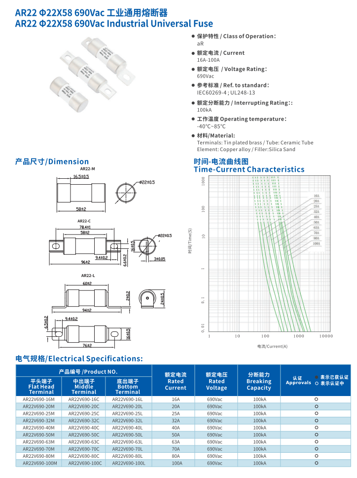 簡述: 工業通用熔斷器 AR22 22*58 690VAC INDUSTRIAL Universal Fuse