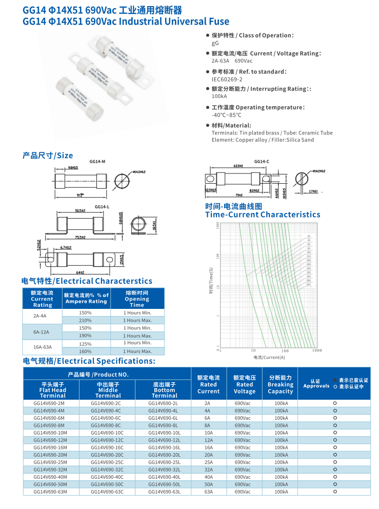 產(chǎn)品名稱: 工業(yè)通用熔斷器CG14 14*51 690VAC INDUSTRIAL Universal Fuse